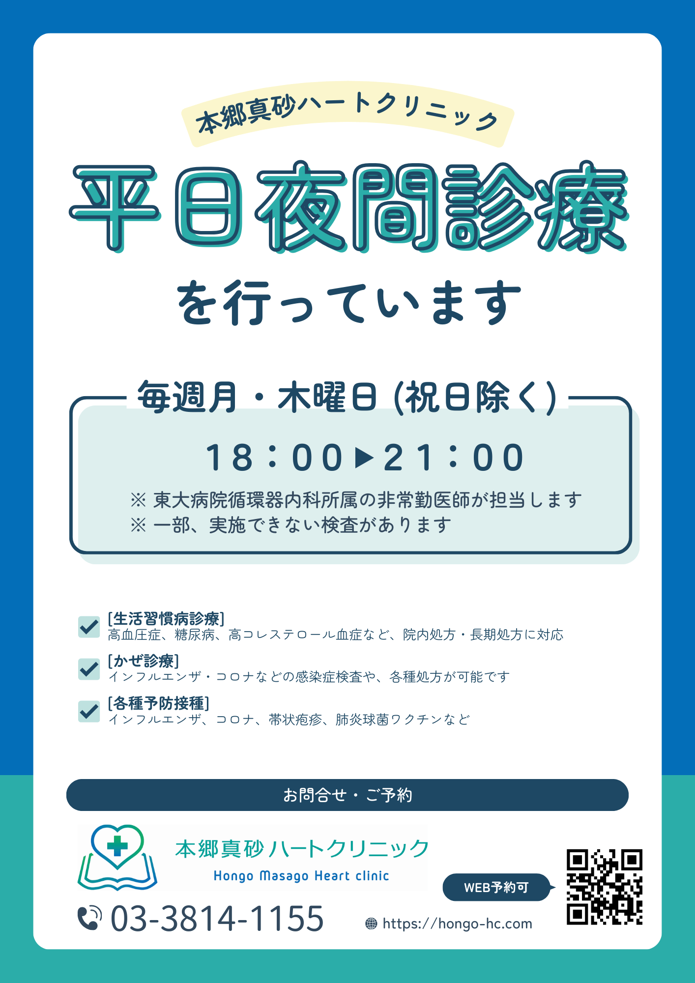 「日中は仕事や学校でなかなか受診できない」といった多くの皆様の声にお応えし、当院では、毎週月曜日と木曜日の18時から21時まで、夜間診療を行っております。これまで時間の都合で受診が難しかった方も、お仕事帰りなどにぜひご活用ください。