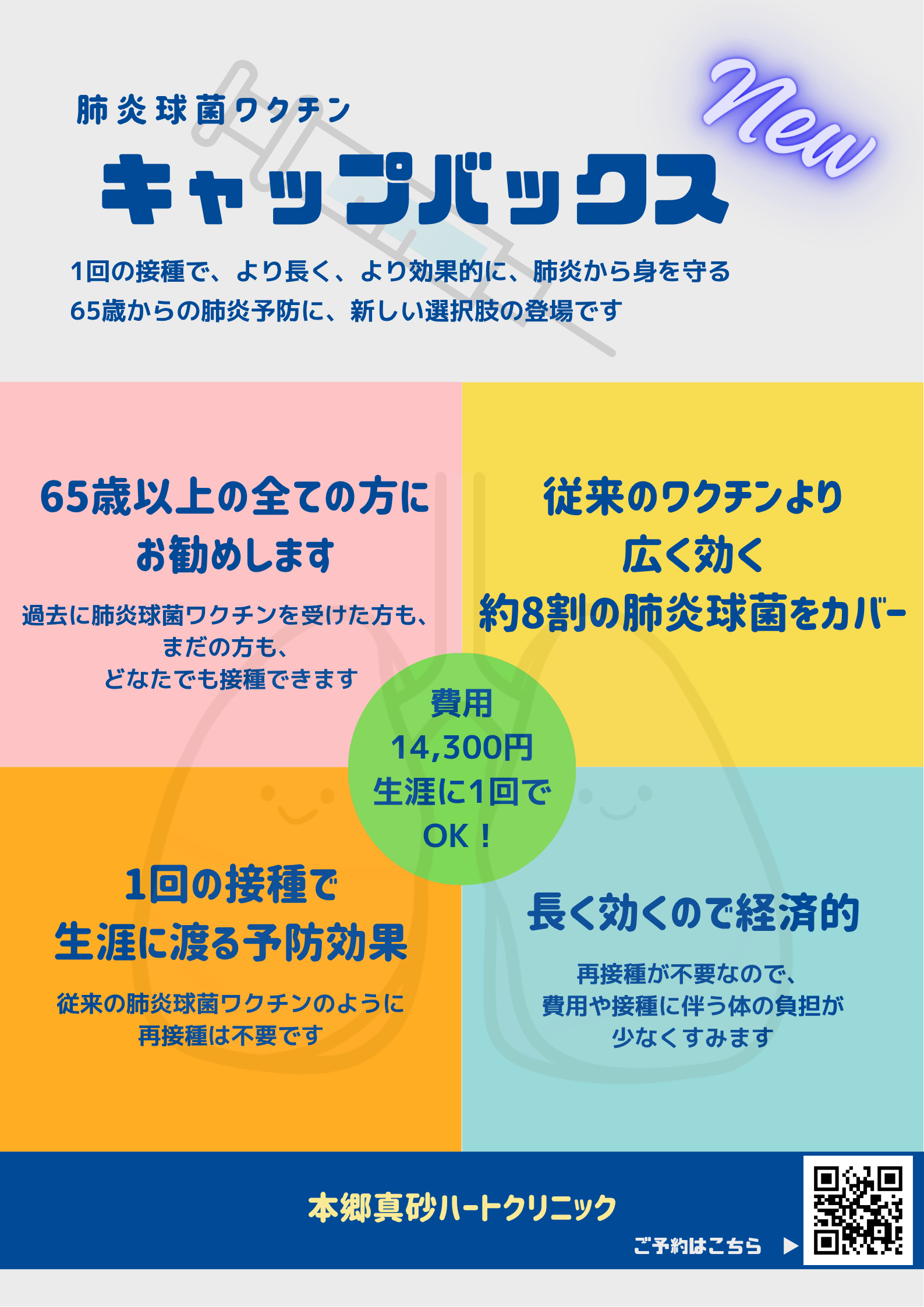 - キャップバックス®の接種に公費補助はありませんが、1回の接種で完結するので、肺炎球菌ワクチンを接種したことが無い方への初回接種にも推奨されます。
